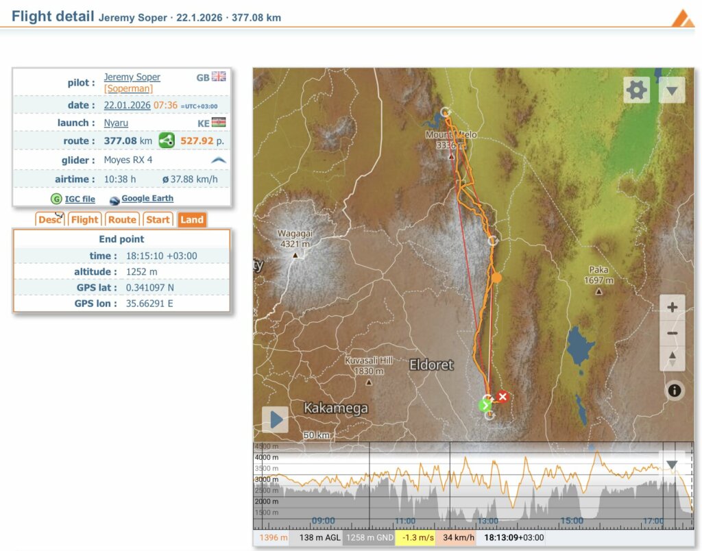 Jeremy bat le précédent record à Owen’s Valley (USA) qui était de 358 km (réalisé par Owen Morse en 2020, et oui, oui, le pilote porte le même nom que la vallée, mais c’est juste une énorme coïncidence !).